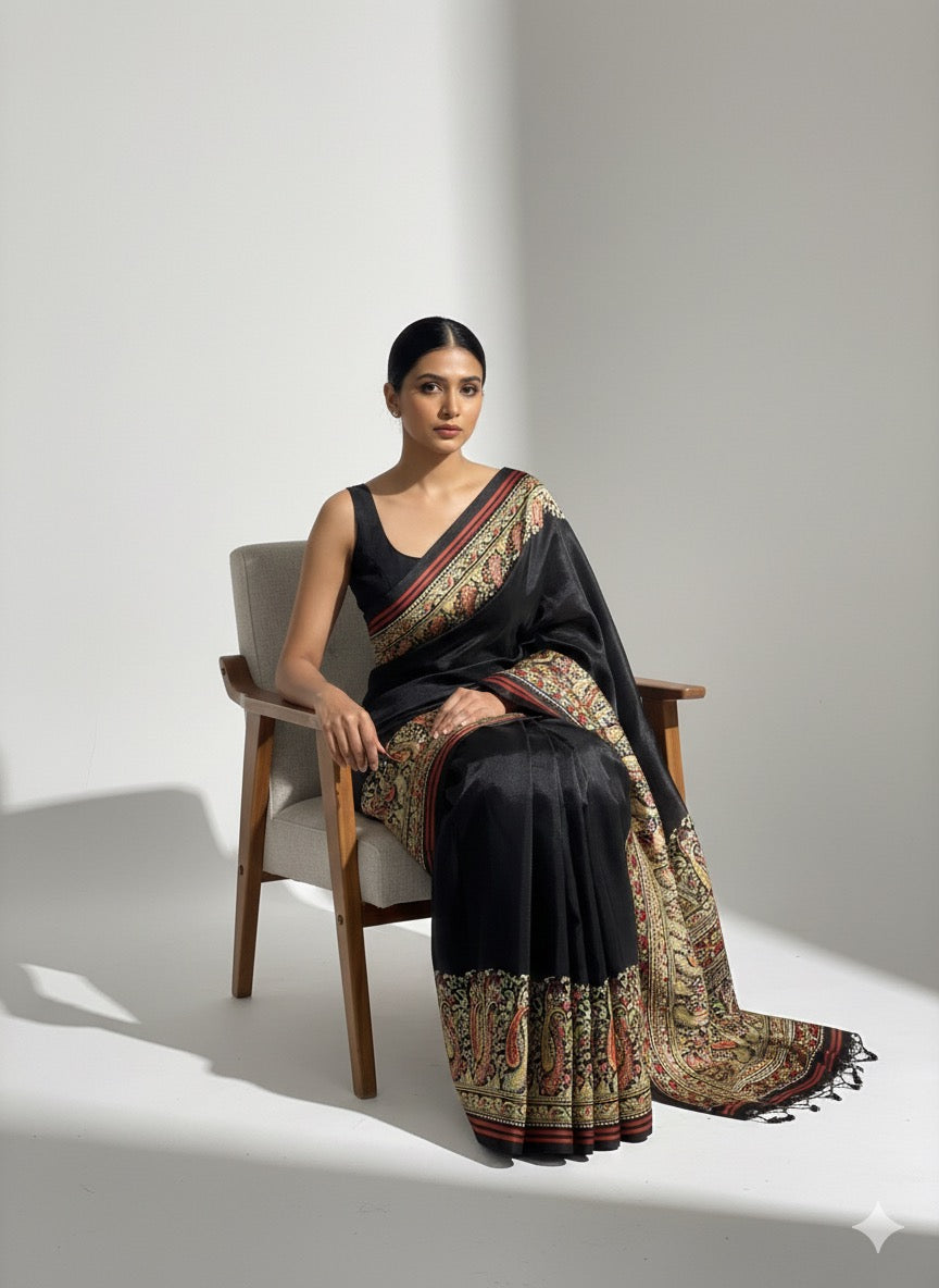 Ajrakh Symphony – Handcrafted Silk Drape Black