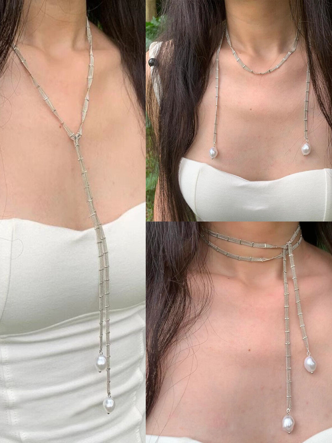 Niska Silver Lace Pearl Long Necklace Minimalist Wrap Design