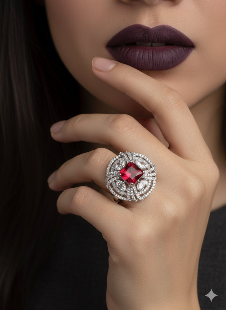 Niska Rhodium-Plated Ruby Red & Cubic Zirconia Studded Openable Floral Statement Ring