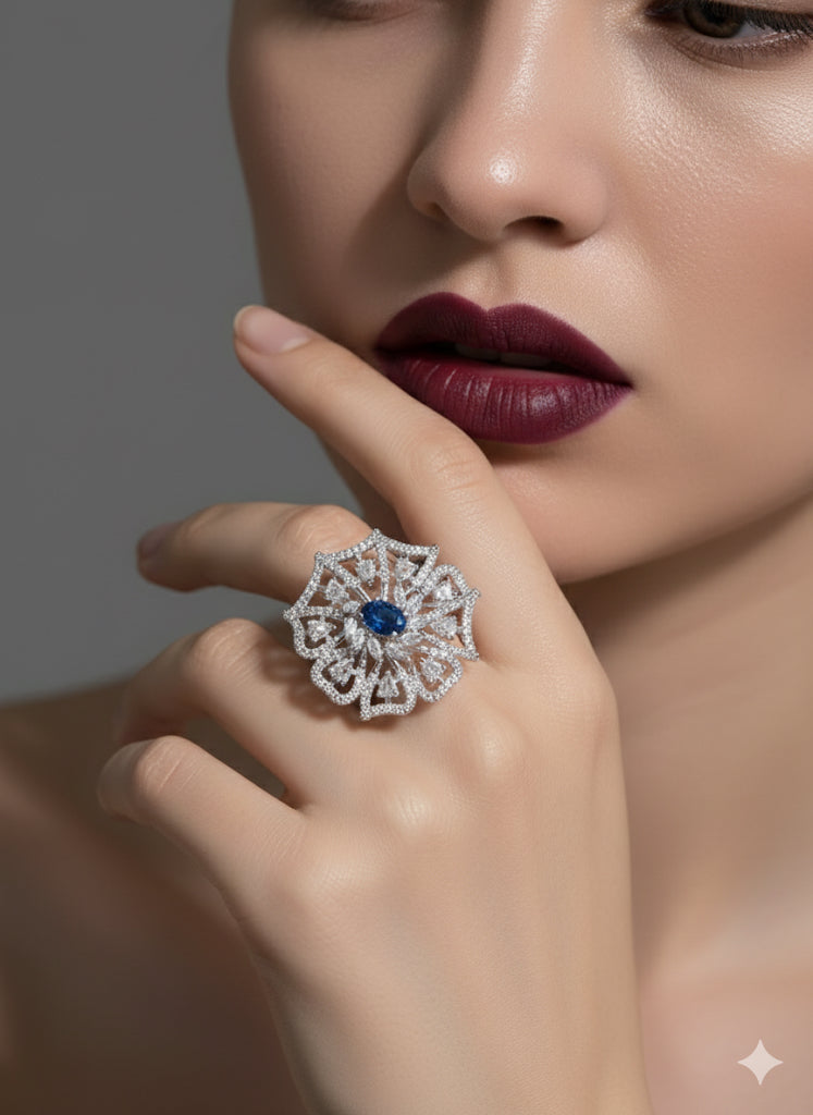 Niska Rhodium-Plated Blue & Cubic Zirconia Studded Openable Floral Statement Ring