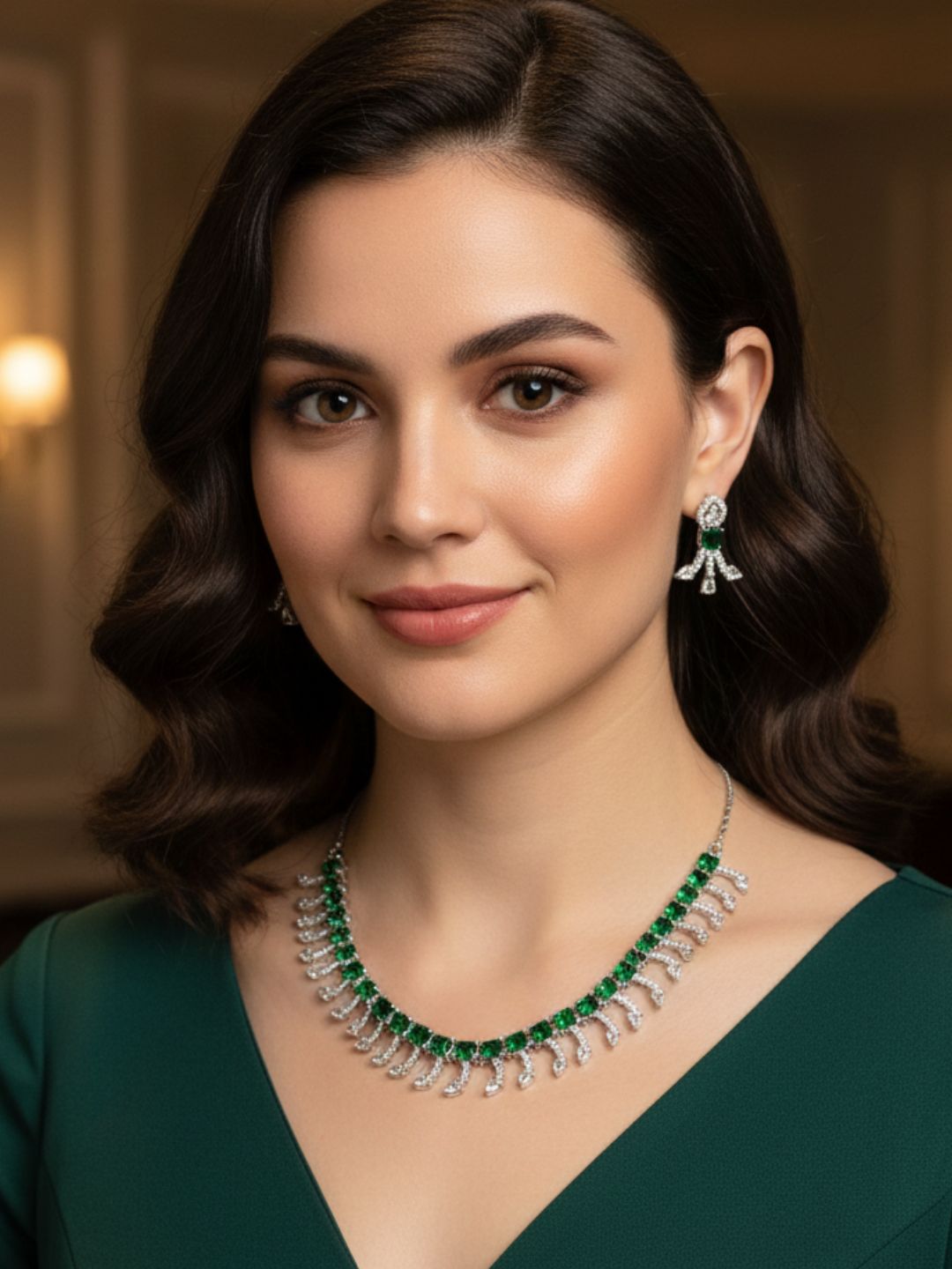 Indulge in luxury with our Rhodium Plated Emerald & CZ Necklace Set. Adorned with sparkling...
