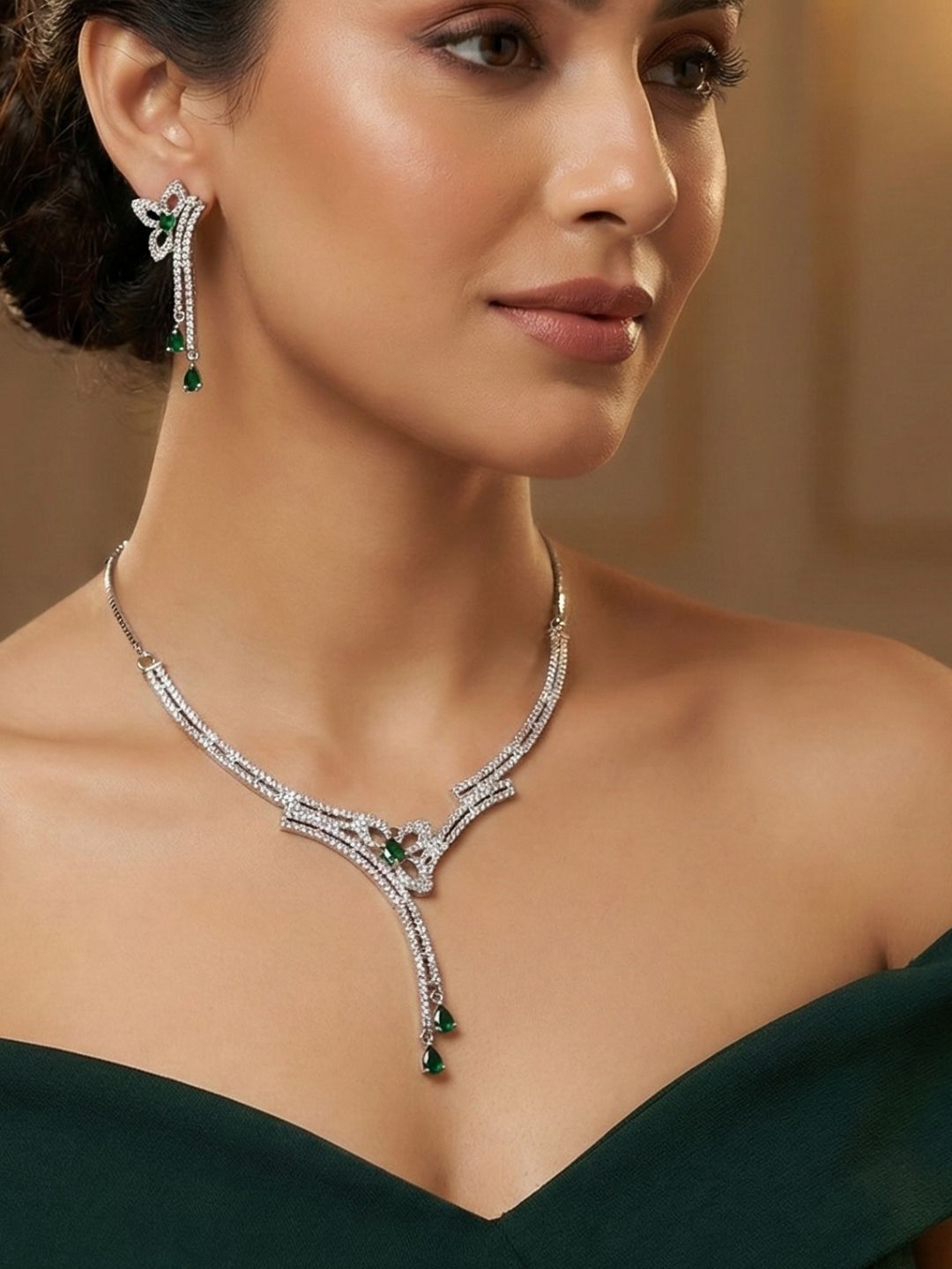 Niska Rhodium-Plated Brass Green Sapphire & White Cubic Zirconia Studded Necklace Set