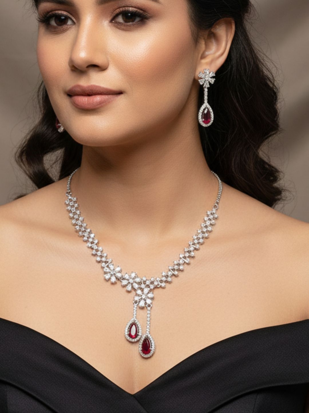 Niska Rhodium-Plated Brass Red Cubic Zirconia Studded Necklace Set