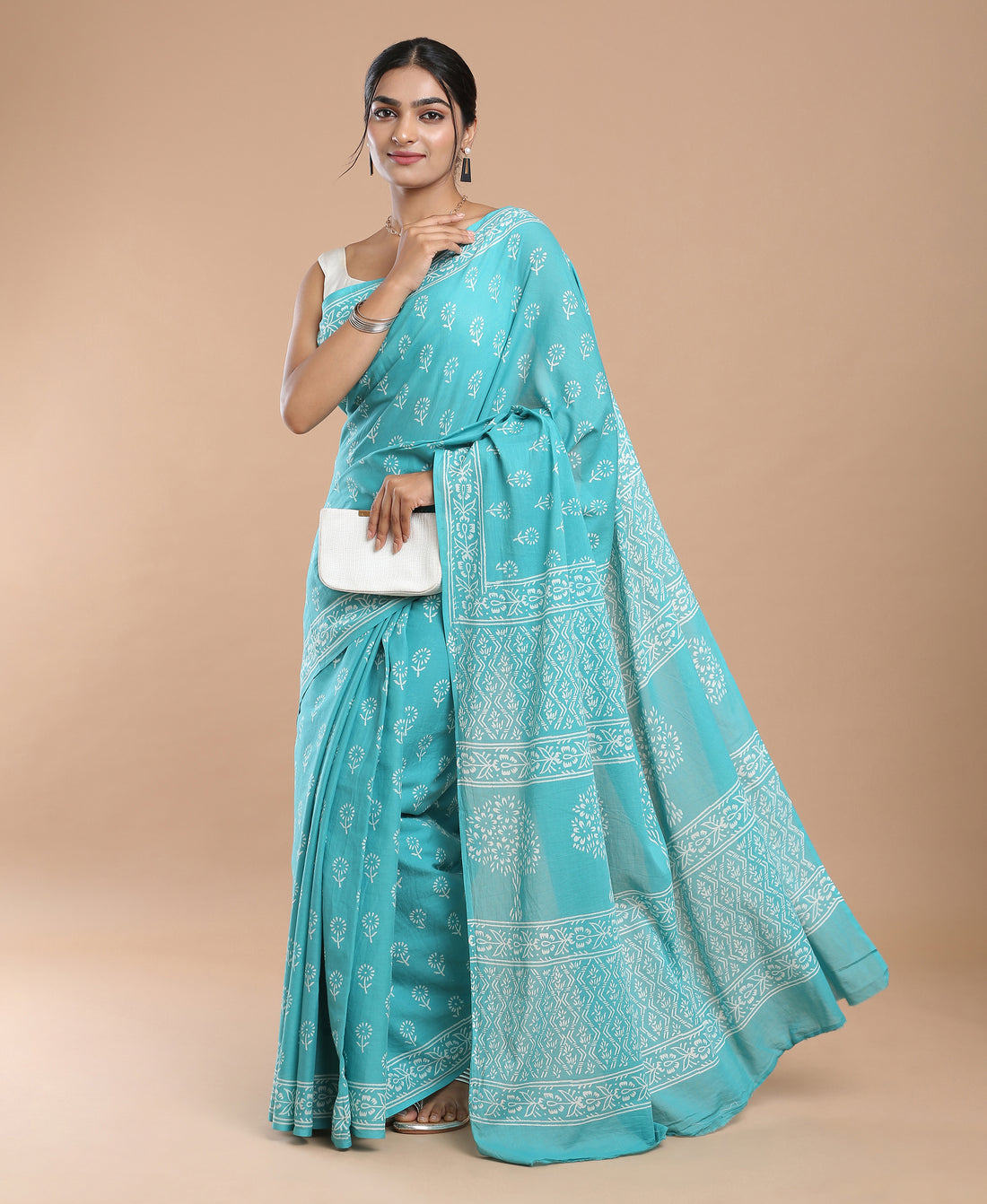 Seldon Green Mulmul Cotton Dabu Print Saree
