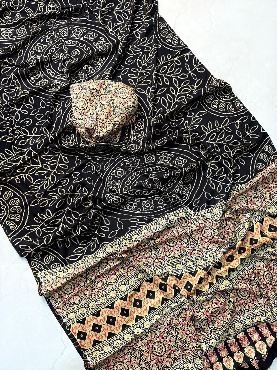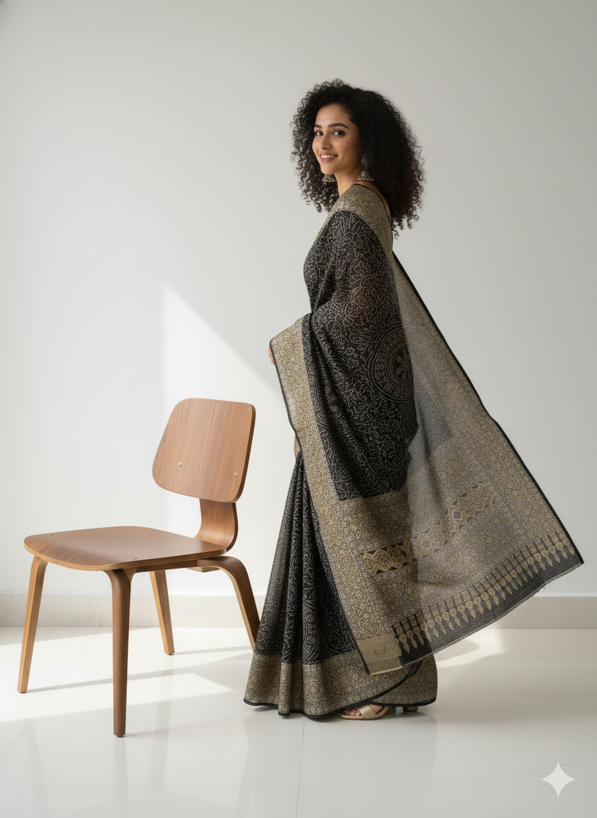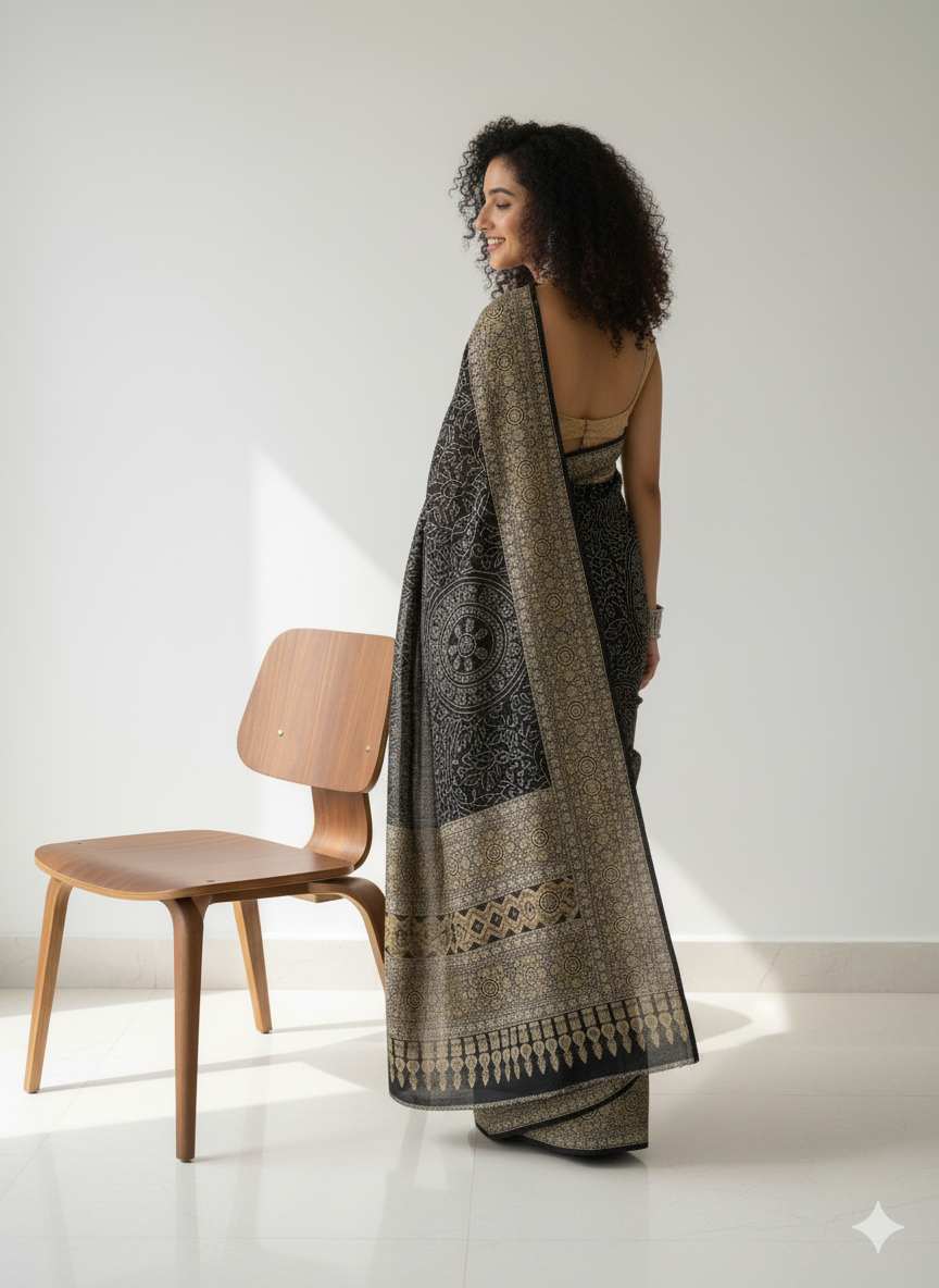 Ajrakh Symphony – Handcrafted Silk Drape Black