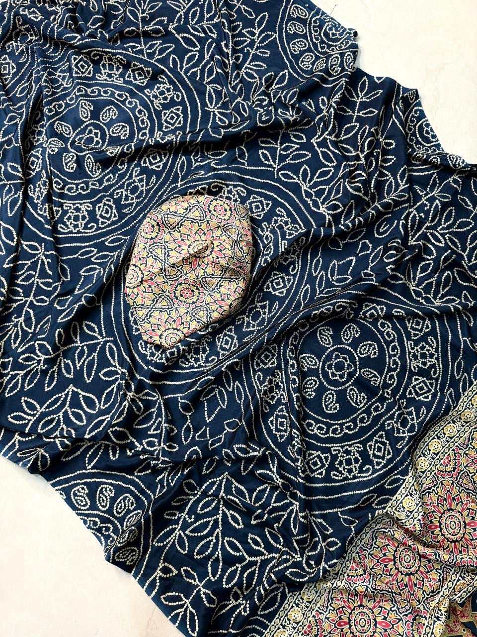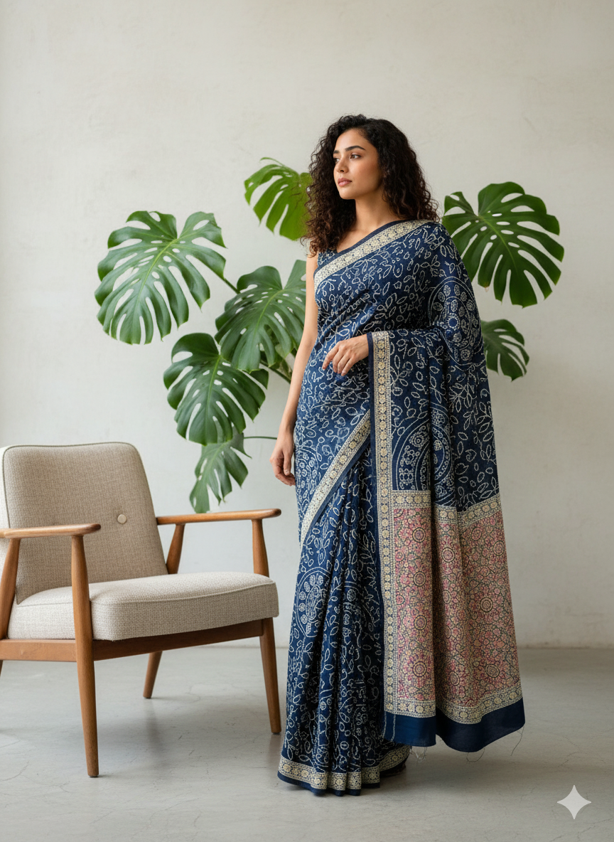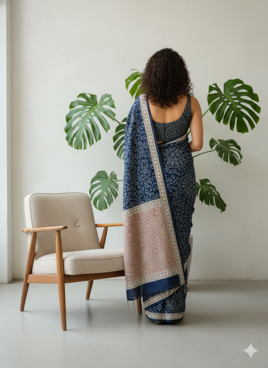 Ajrakh Symphony – Handcrafted Silk Drape Blue