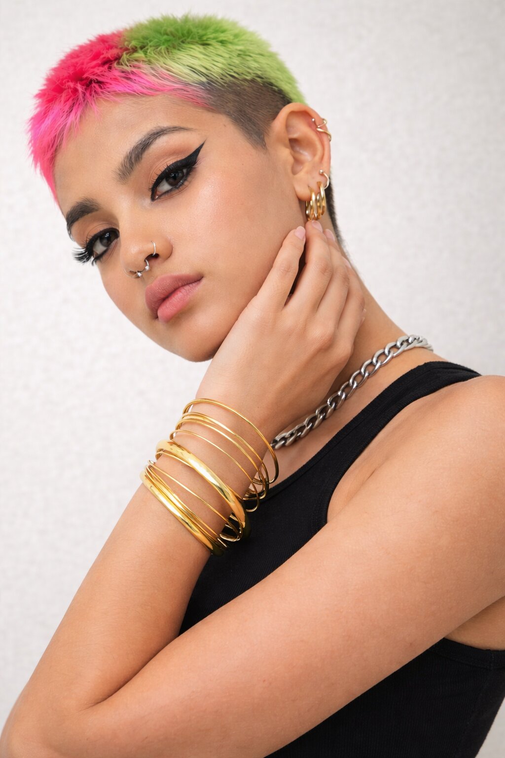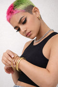 Elevate your ethnic ensemble with this stunning 14-piece bangle set, where geometric rhombus twists meet timeless tradition. Each bangle is crafted with anti-tarnish technology, keeping your jewelry looking radiant through countless celebrations and everyday moments. Perfect for layering or mixing and matching, this versatile collection lets you express your unique style while honoring classic aesthetics. Whether you're dressing up for a festival or adding flair to your daily look, these bangles are your go-to accessory for that perfect finishing touch.