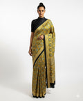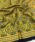 A bold play of tradition and modern elegance. This mustard Ajrakh-inspired saree is detailed with intricate geometric motifs and finished with a striking black border for contrast. Effortless to style yet rich in character, it’s designed for women who like their classics with a contemporary edge—perfect for workdays, cultural evenings, or statement dressing without the extra fuss.