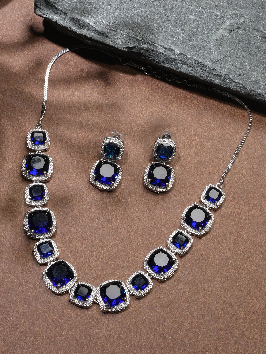 Necklace Set : Niska rhodium-plated brass necklace set with matching earrings, studded with blue sapphire and white cubic zirconia stones. A timeless piece for weddings, parties, and festive celebrations.