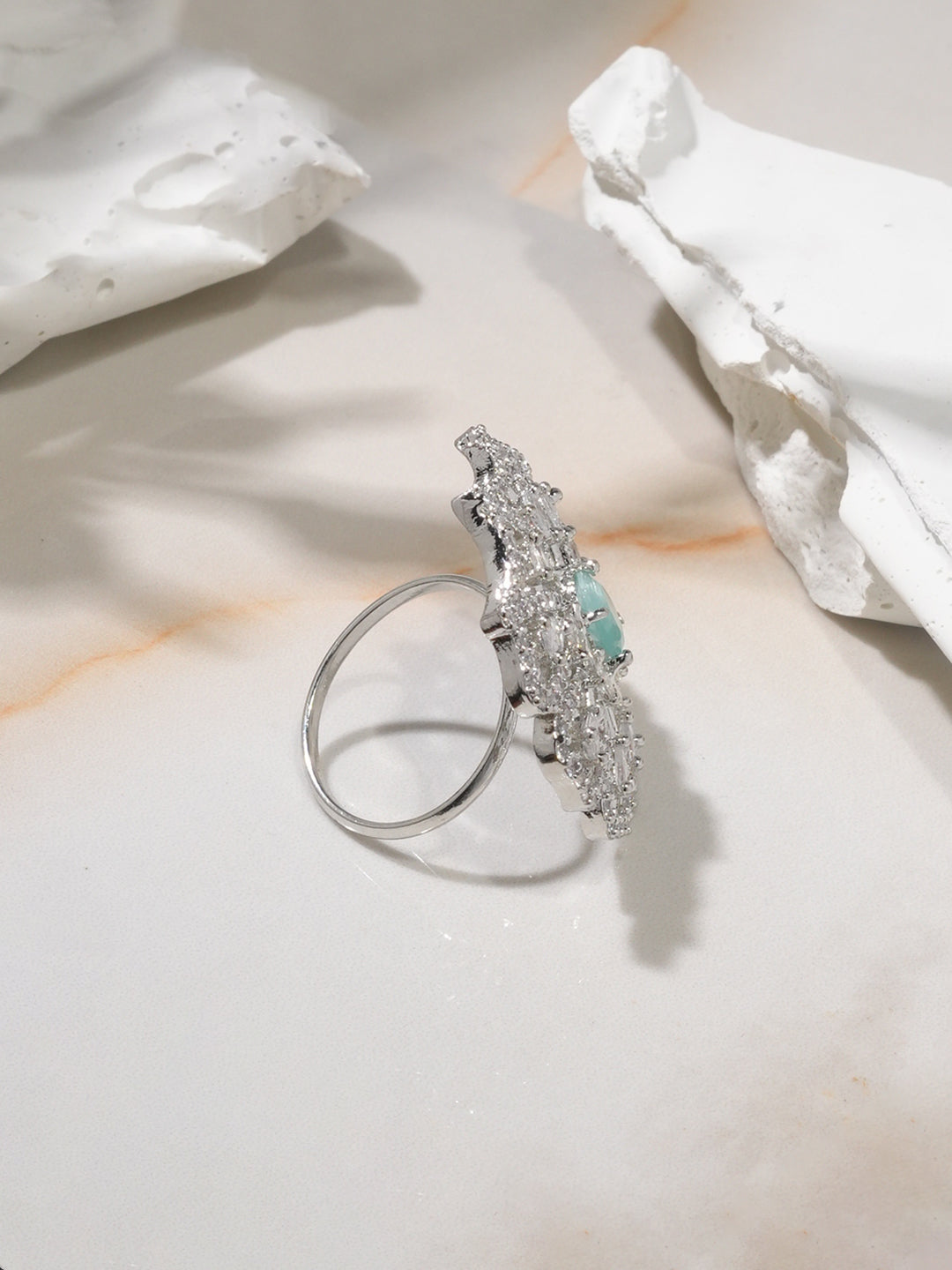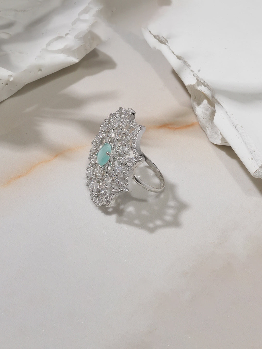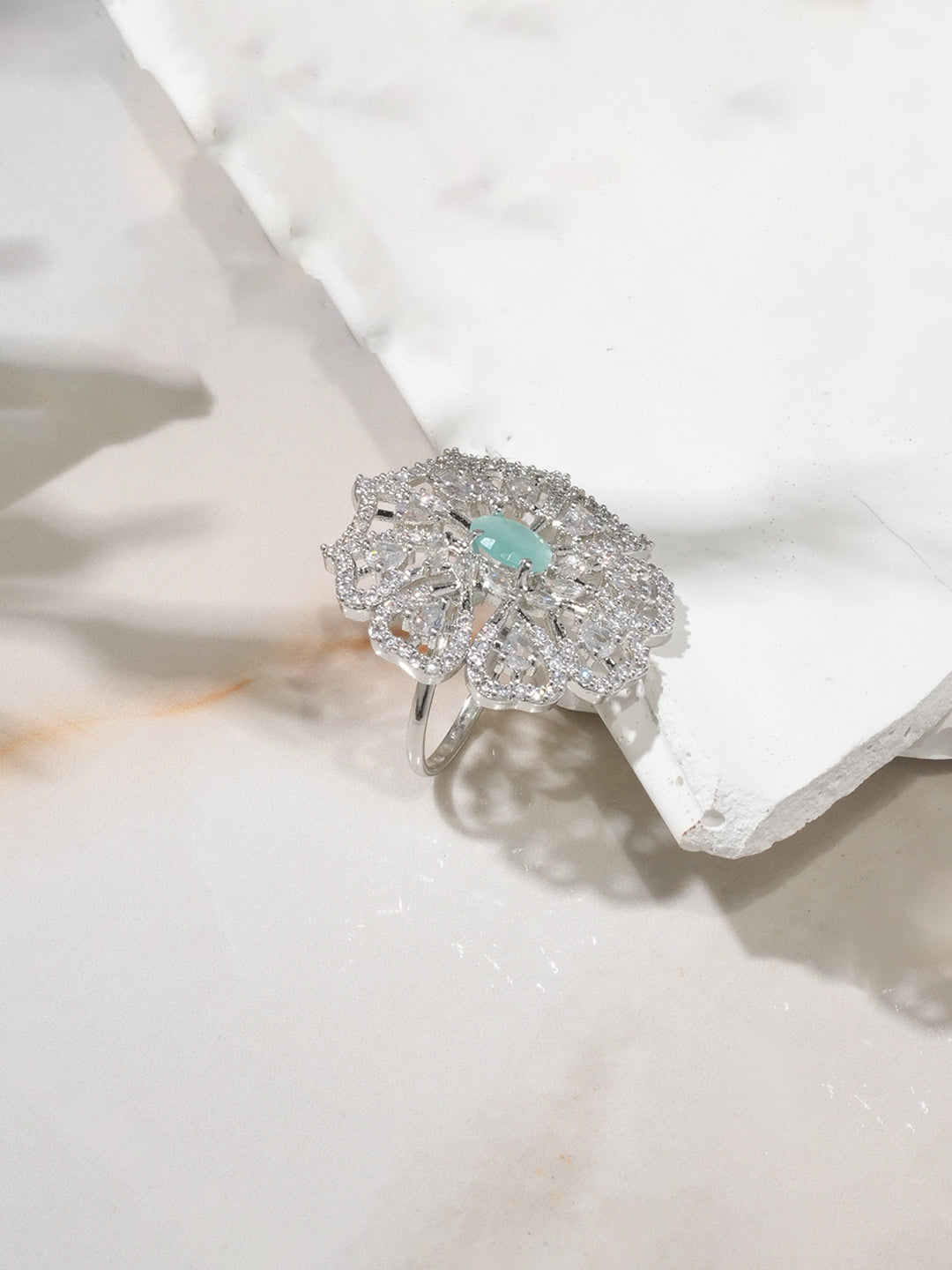 Ring : Enhance your elegance with this rhodium-plated openable statement ring, featuring a floral-inspired design with sea green stones and cubic zirconia detailing for a luxurious touch.